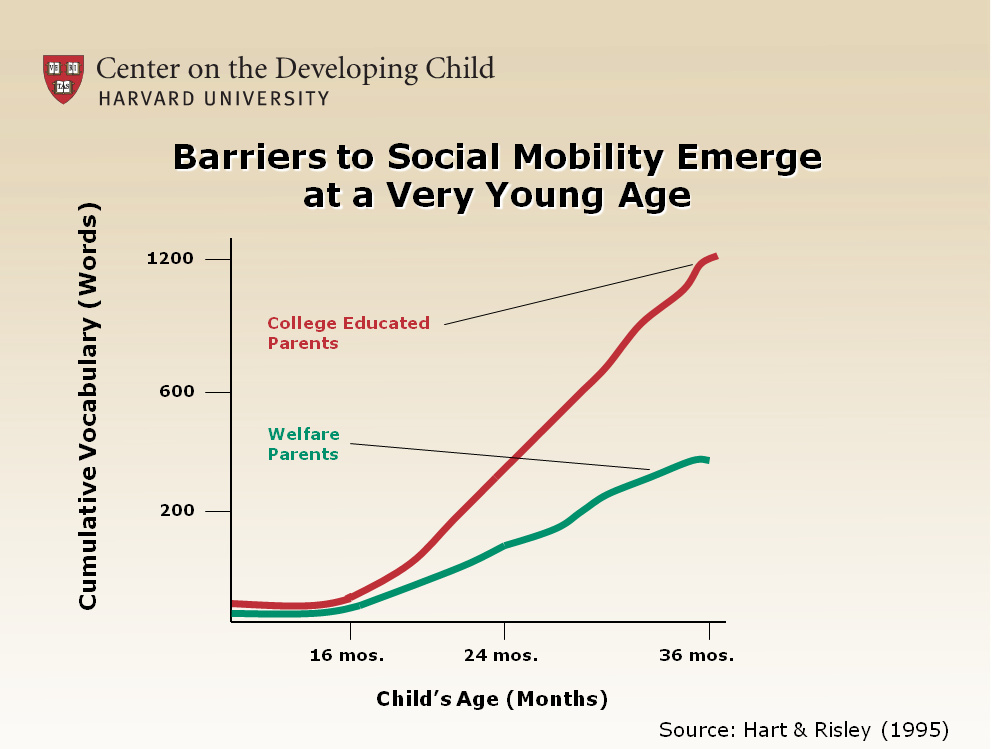 The effect of environment on language development is staggering. A child’s early experience of language produces measurable differences in cognitive ability by 9 months of age and significant disparities in language (and, by consequence, social and cognitive development) by age 3, as evidenced in the graph above.